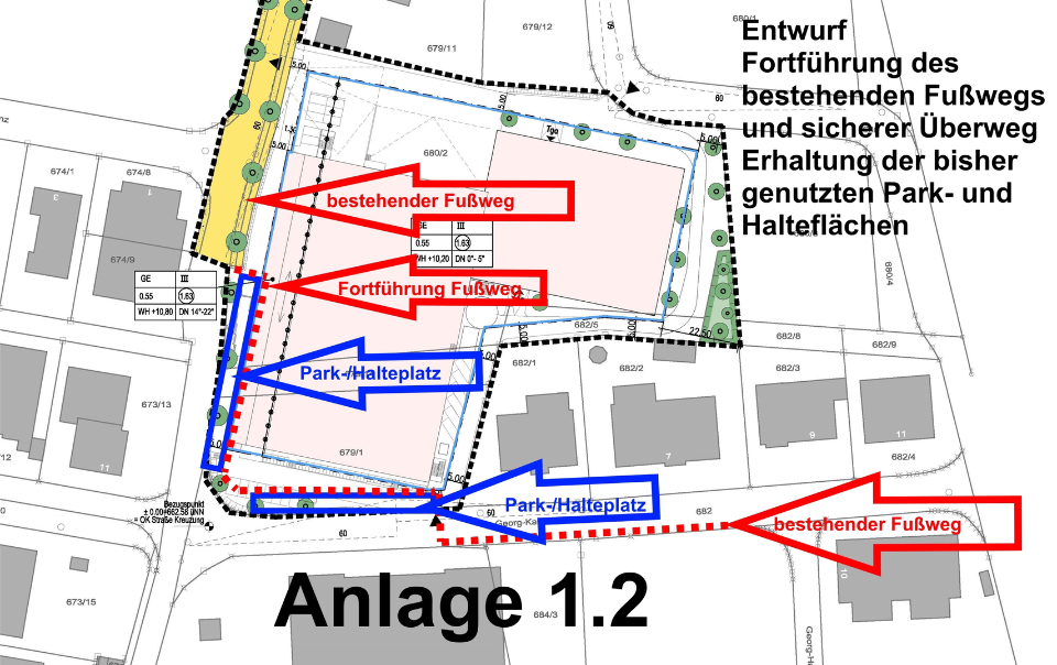 Entwurf Fortführung des bestehenden Fußwegs und sicherer Überweg Erhaltung der bisher genutzten Park- und Halteflächen